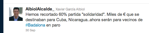 Com es poden deixar anar en tant poques paraules tants improperis? És un orgull  retallar una partida de solidaritat, i a sobre fent entendre una enemistat vers països com Cuba, Nicaragua? Naturalment aquest comentari ha creat molts comentaris a twitter, a continuació he copiat els que m'han semblat més interessants: @marcelmauri: @AlbiolAlcalde_ puc entendre (q no compartir) q en èpoques difícils haguem de redimensionar la solidaritat. No entenc q en fem bandera. @Albertu84: @AlbiolAlcalde_ Yo soy parado en #badalona, pero no m parece bien recortar una obra solidaria, de momento aqi podemos comer, alli no se... @eesteve: @AlbiolAlcalde_ no em sembla que sigui un tema per presumir. De nou sona a demagògia.   @palauJosep: Seguir a @AlbiolAlcalde_ és com fer un curs accelerat de populisme demagògic. Convalidarà crèdits? #badalona @eloiserrano: @AlbiolAlcalde_ No entén el concepte Solidaritat,el confon (amb sort)amb el de Caritat. Normal, ell no creu amb la justícia social #Badalona